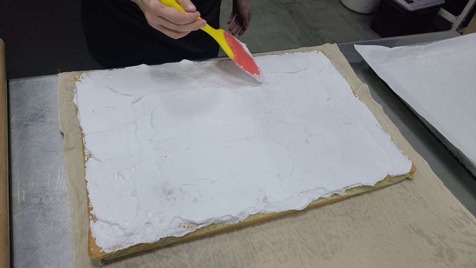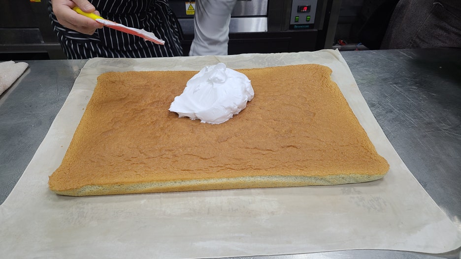 생크림 휘핑: 휘핑크림을 손으로 휘핑하여 겉면에 고르게 올려줍니다. (초코 롤케이크와 동일합니다.)