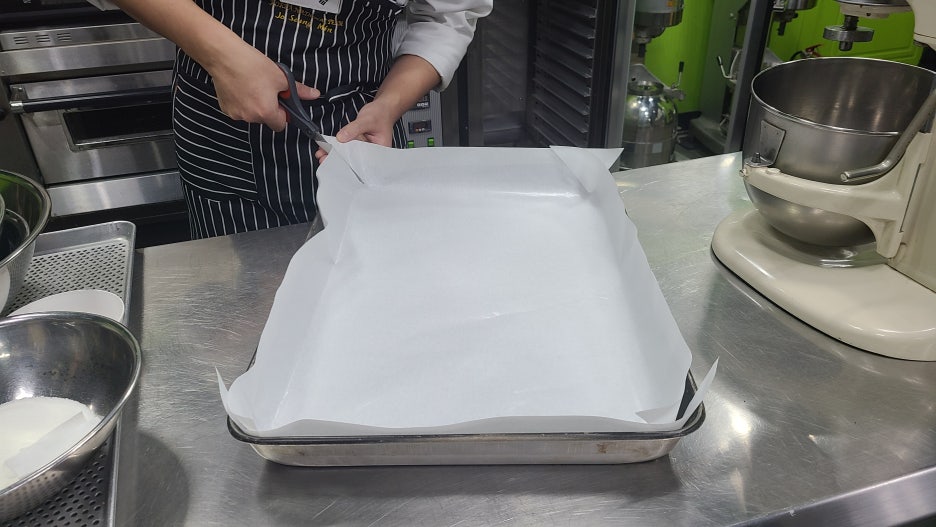 높은 팬 준비하기: 높은 팬에 유산지를 깔아 준비합니다.
