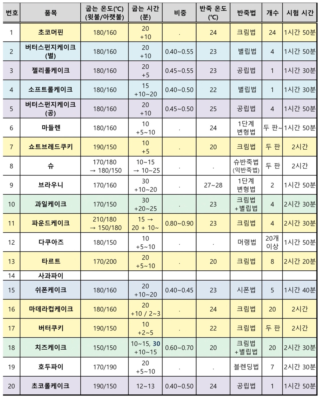그리고 종합적으로 만드는 법, 굽는 온도 및 시간 등을 확인하기 위해 모든 품목을 위와 같이 엑셀로 정리하여 외웠습니다. 시험지에 나와있는 정보와 학원에서 배운 내용을 정리한 것입니다. 셀의 색 별로 비슷한 제조 방법 별로 묶은 것입니다. (제가 시험을 치를 당시에는 흑미쌀 롤 케이크는 포함되어 있지 않아 목록에 없습니다.)